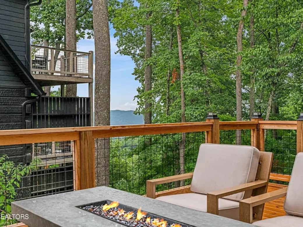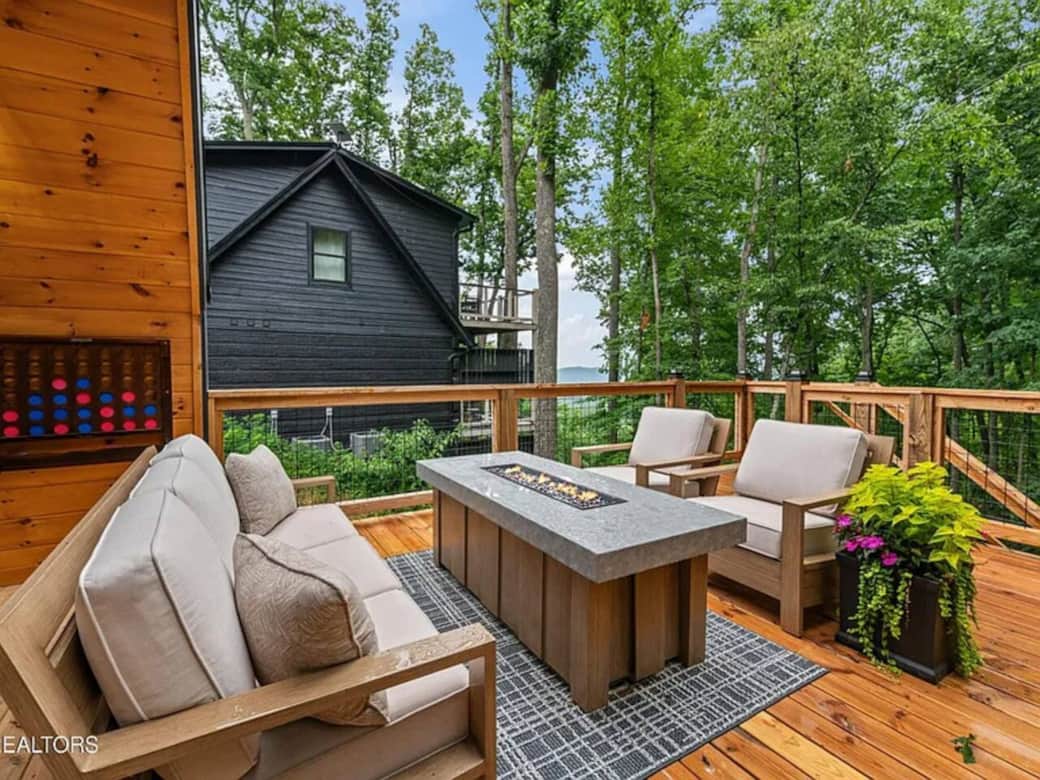 Step outside to the spacious rear deck, complete with a hot tub under the stars, comfortable lounge seating, and a gas fire pit for those cool Smoky Mountain nights. Inside, you’ll also find arcade games, a cozy fireplace, high-speed Wi-Fi, and a washer/dryer for your convenience — plus an EV charger for eco-friendly travelers.